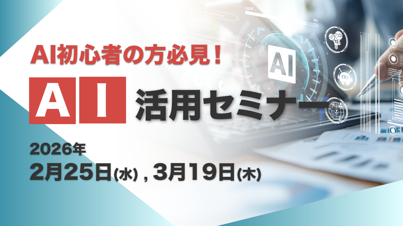 2/25(水),3/19(木) AI活用セミナー開催のお知らせ 2026年1月28日 AI活用セミナーのお知らせです!AI初心者の方必見!基礎から業務での活用までわかりやすく解説します! 開催日程: 2026年2月25日 (水)2026年3月19日 (木) 開催時間: 【午前の部】 10:30~12:00